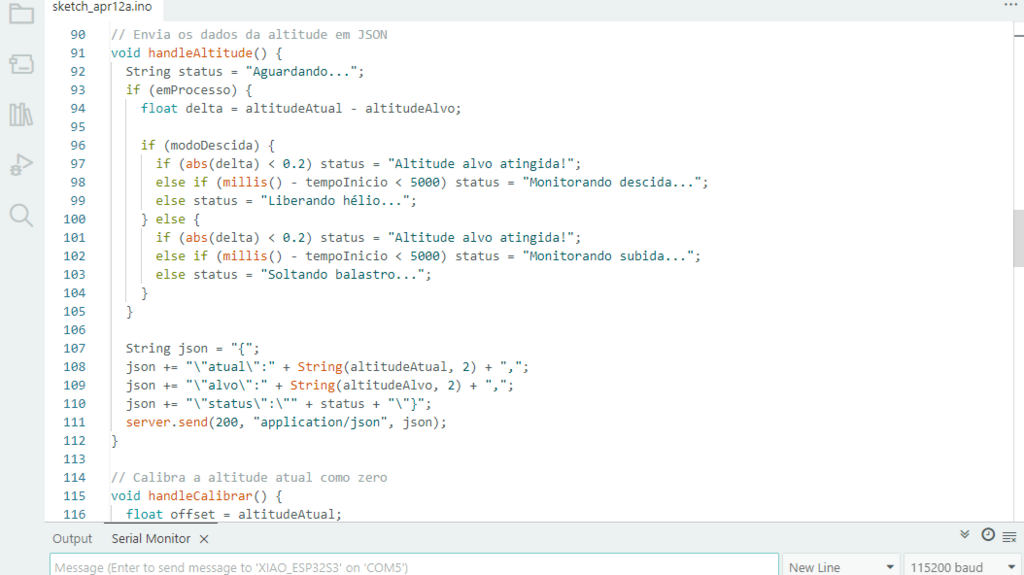CÓDIGO ARDUINO: A lógica principal do projeto foi escrita em C++ e ainda não foi testada por falta de material, mas já está pronta para testes. O código envia dados em formato JSON e implementa uma função para calibração da altitude, além da lógica para controle de subida e descida do balão.